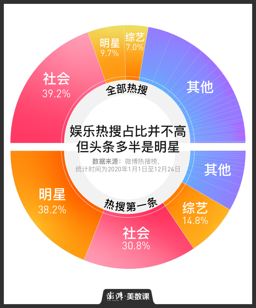根據澎湃新聞美數課的調研,在2020年微博的10萬條熱搜中,有近四成是社會熱點事件。微博作為一個話題廣場,在公共事件中具有重要的導向作用。