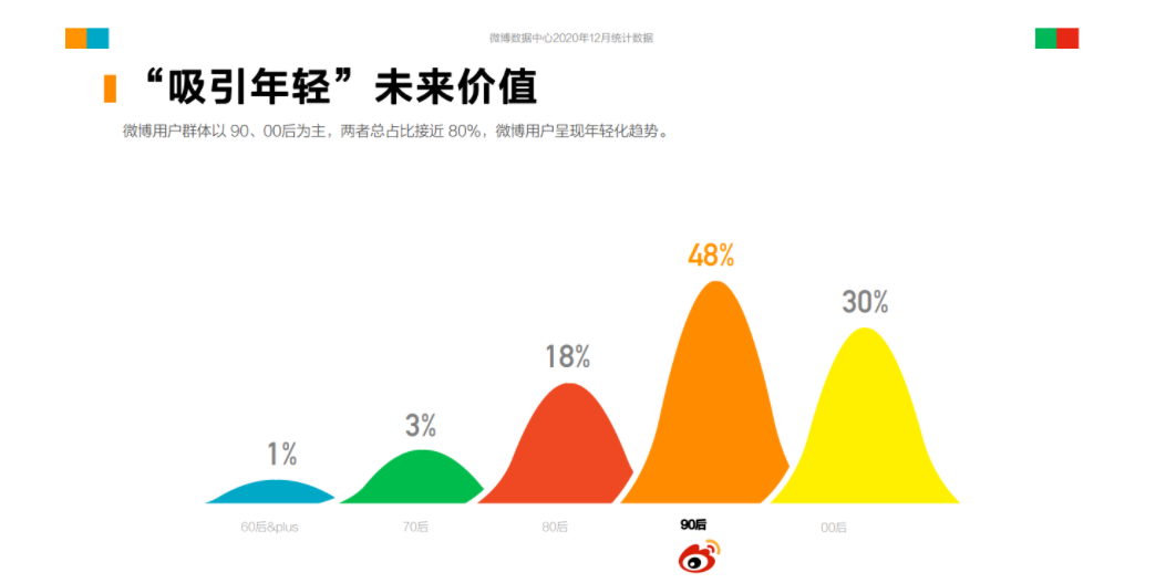 而微博的用户年齡更小,據微博2018年的數據顯示,微博30歲以下用户高達80%,22歲以下用户佔比更高達41%。