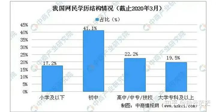 根據統計,中國網民中擁有大專及以上學歷的,僅有19.5%;接近60%的網民僅有初中以下文化。