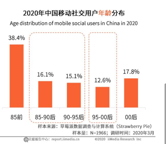 這是中國移動社交用户的一個年齡分佈圖,85後佔比超過60%,00後更是生力軍。