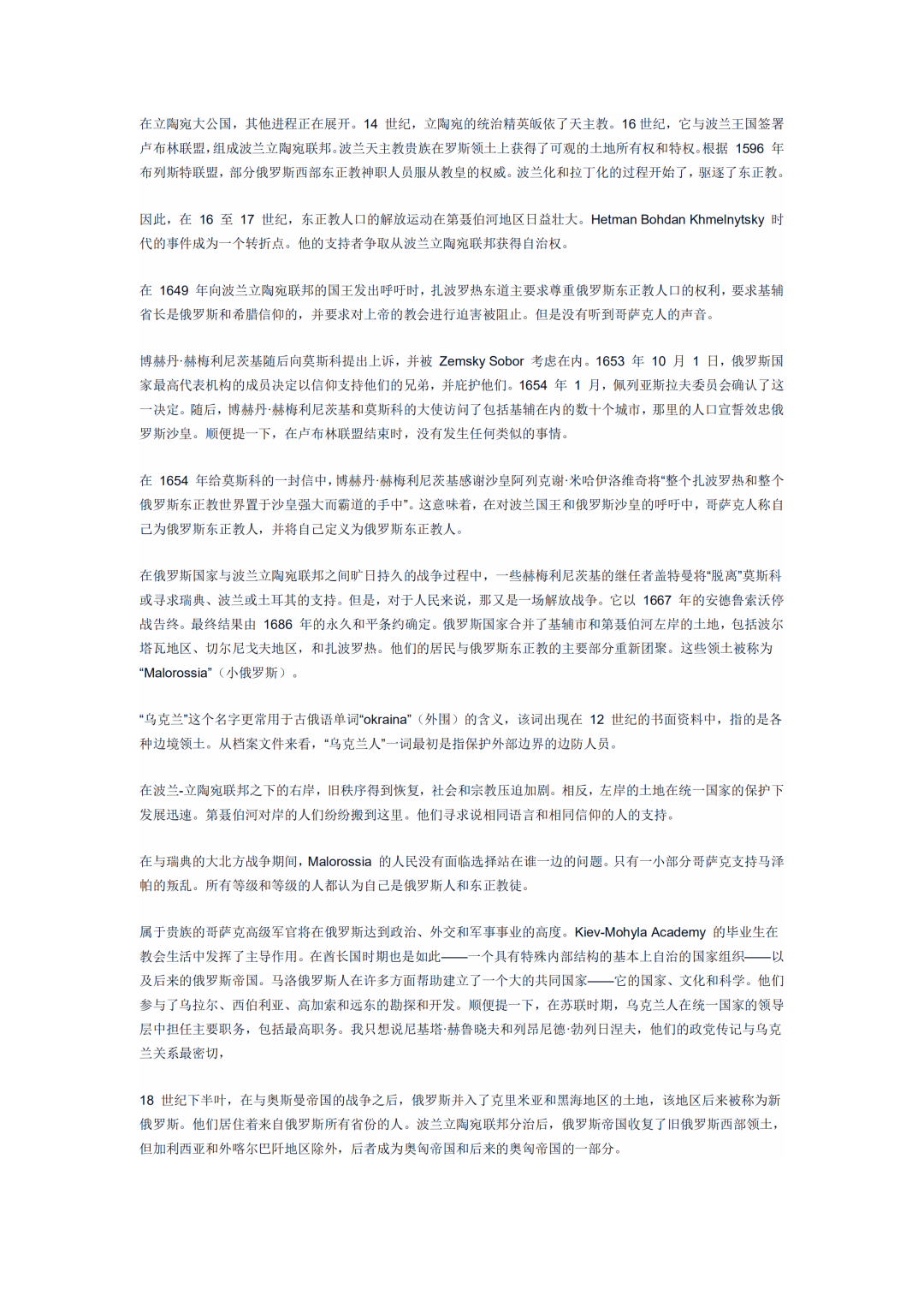 為了奪回基輔等“龍興之地”,俄羅斯與波蘭-立陶宛聯邦進行了曠日持久的戰爭。普京在他的文章中稱,這是一場“解放戰爭”。解放被天主教徒和拉丁文化壓迫的、烏克蘭地區的斯拉夫人。