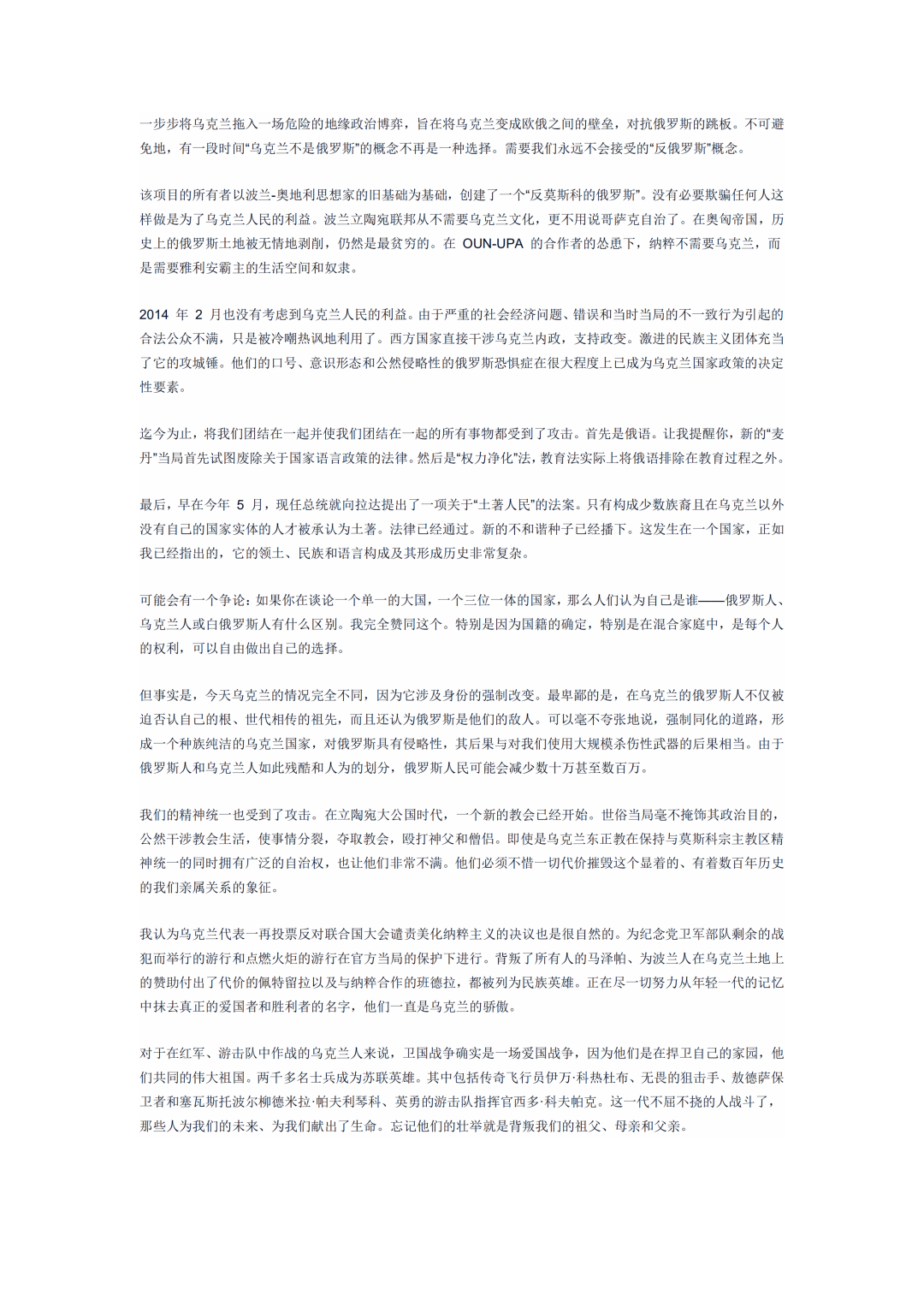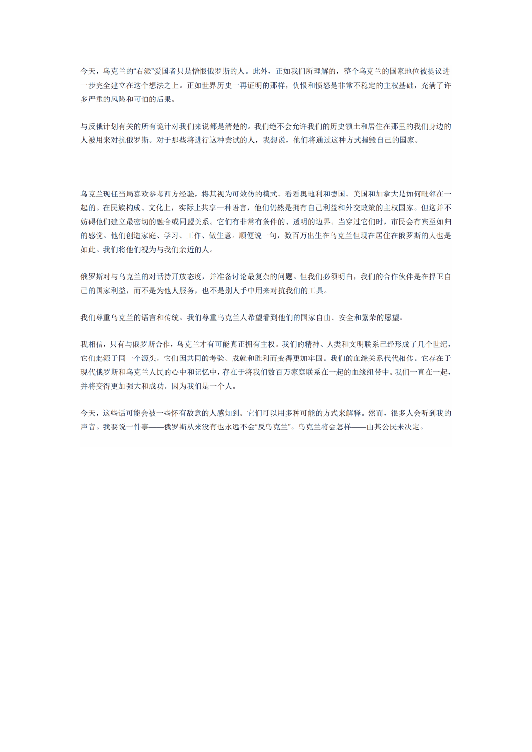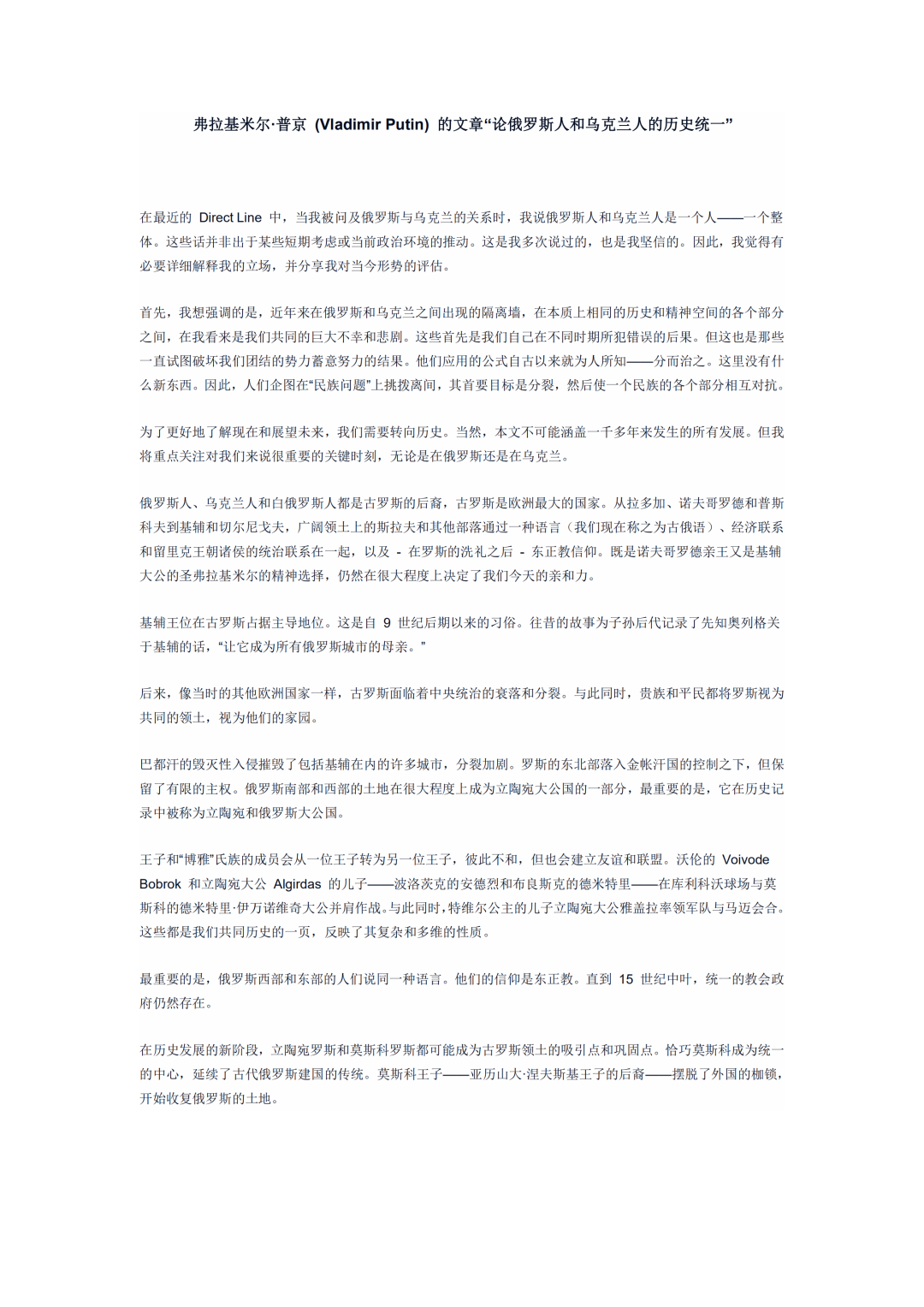 普京的文章開門見山,第一段就直接説:“俄羅斯人和烏克蘭人同屬於一個民族,我們是一個整體。”