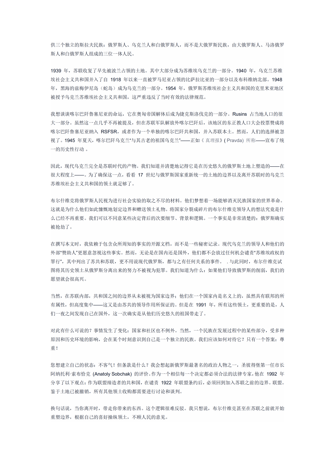 由於早期布爾什維克主義者對於蘇聯的構想並不是一個國家,而是一個最終解放全人類的社會主義國家聯盟。所以規定各個加盟共和國有自由加入和退出蘇聯的自由,普京在文章中説:“在我們國家的根基上埋下了最危險的定時炸彈”。當然,這是他的個人觀點。
