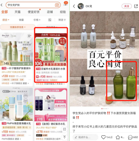 譬如,不論是在淘寶還是在小紅書搜索關鍵詞“學生黨護膚”,都會出現百雀羚等國牌的身影。“螳螂財經”大致瀏覽了一下,在這一詞條下,排在前面的基本都是自然堂、薇諾娜,以及近兩年火起來的RNW、璦爾博士等國牌,很少會看到國外品牌。