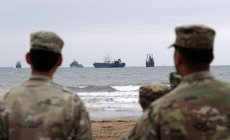 2017年4月11日,韓美軍方在韓國慶尚北道浦項市舉行軍需物資兩棲補給演習。圖|新華社