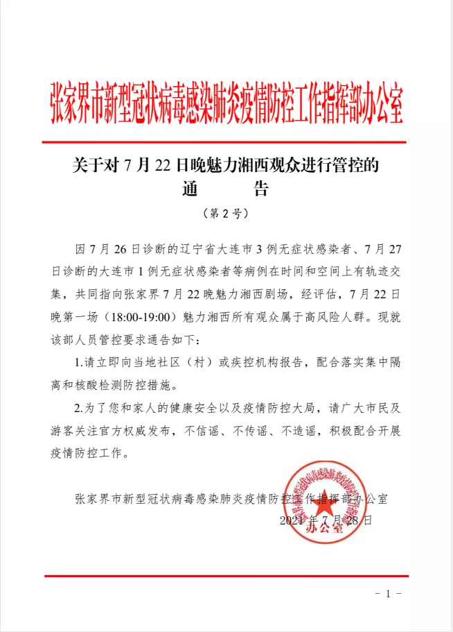 大連市的疫情波及到了遠在湖南的張家界。張家界發佈的《關於對7月22日晚魅力湘西觀眾進行管控的通告》中稱:因7月26日診斷的遼寧省大連市3例無症狀感染者、7月27日診斷的大連市1例無症狀感染者等,在時間和空間上有軌跡交集,共同指向張家界7月22日晚魅力湘西劇場,經評估,7月22日晚第一場(18:00—19:00)魅力湘西所有觀眾屬於高風險人羣。