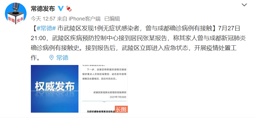 湖南省常德市今天也報告了一例無症狀感染者,該感染者曾在7月23日、24日與成都確診病例在常德活動期間有接觸史。武陵區已進入應急狀態,27日晚連夜開展流行病學調查。