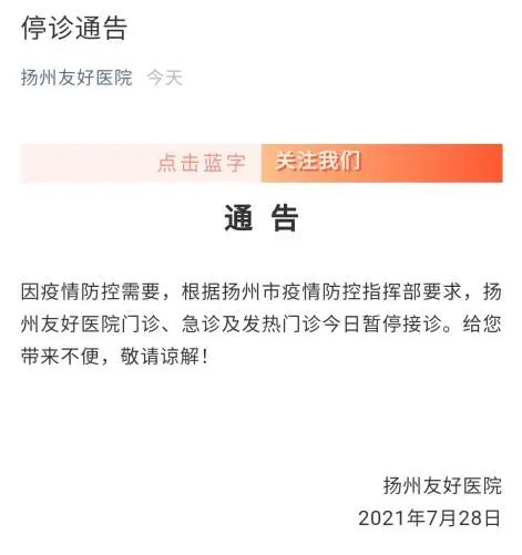 根據揚州市新冠肺炎疫情防控工作指揮部發布的“通告”,自7月28日起,揚州主城區(邗江區、廣陵區、經濟技術開發區、生態科技新城、蜀岡-瘦西湖風景名勝區)範圍內啓動大規模核酸檢測。揚州主城區範圍內的娛樂場所、室內文化體育場所、培訓機構、托育機構、室內宗教場所、洗浴中心等一律暫停開放,餐飲場所禁止堂食,重點區域人員足不出户。