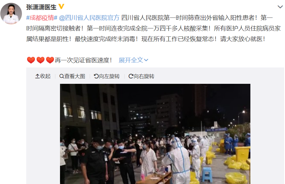 微博認證為四川省人民醫院婦科醫師的“張瀟瀟醫生”發文表示:第一時間連夜完成全院一萬四千多人核酸採集!所有醫護人員住院病員家屬結果都是陰性!最快速度完成終末消毒!現在所有工作已經恢復常態!