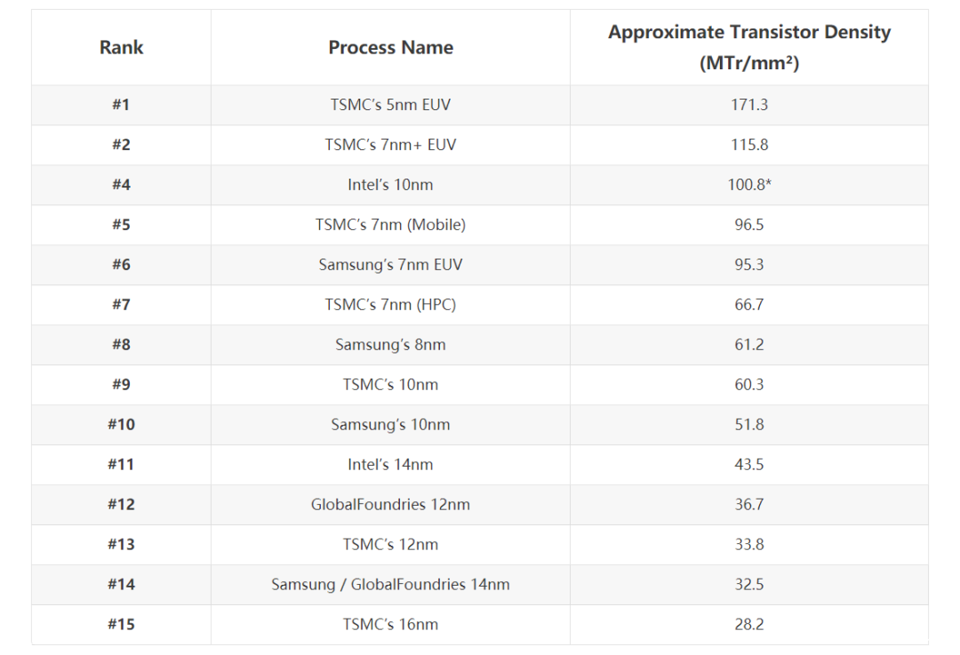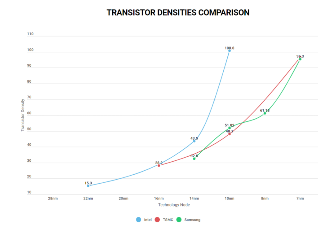為了更好的對比不同廠商間的芯片製程工藝,我們可以拋開表面的芯片命名方式,用芯片晶體管密度數據來一探究竟。