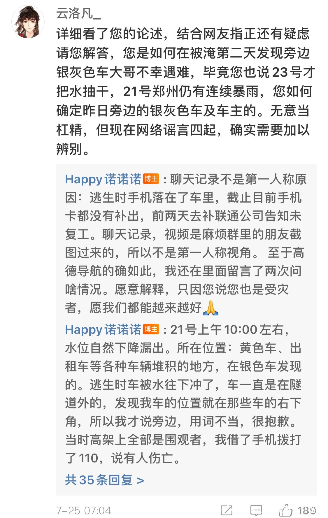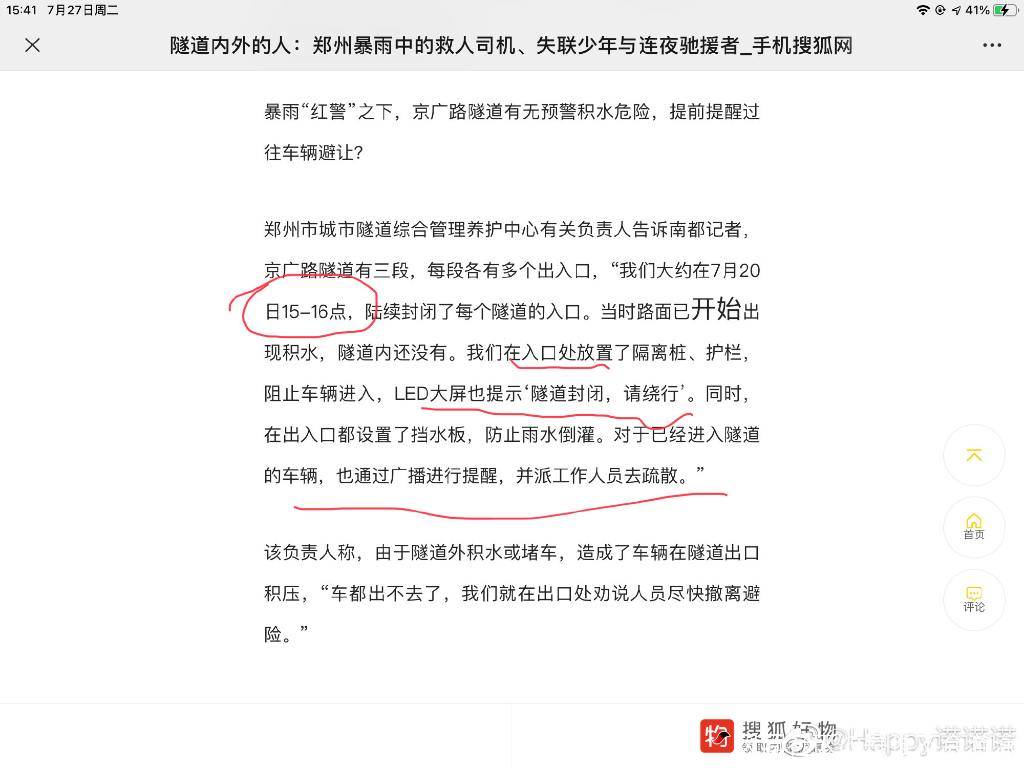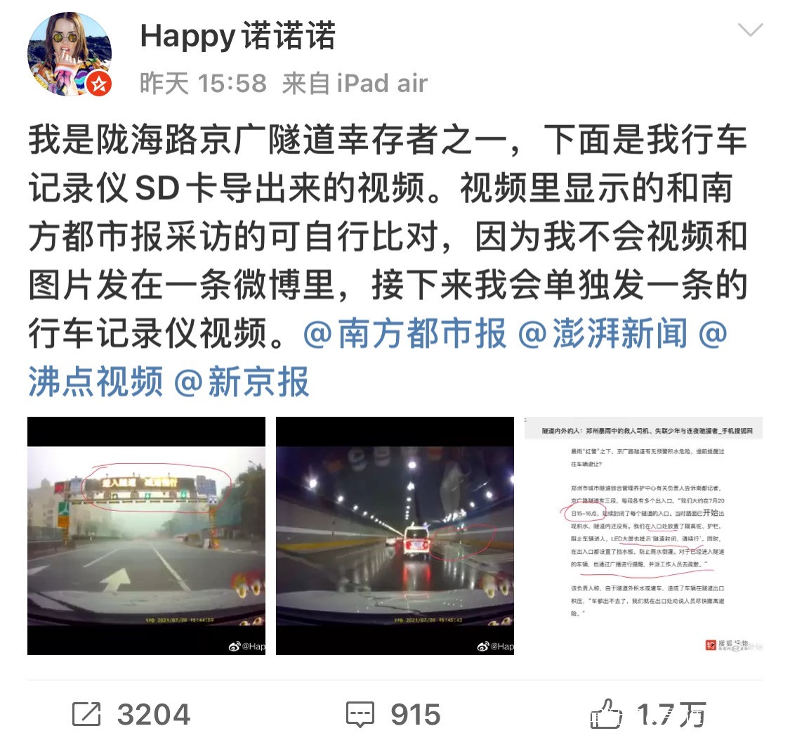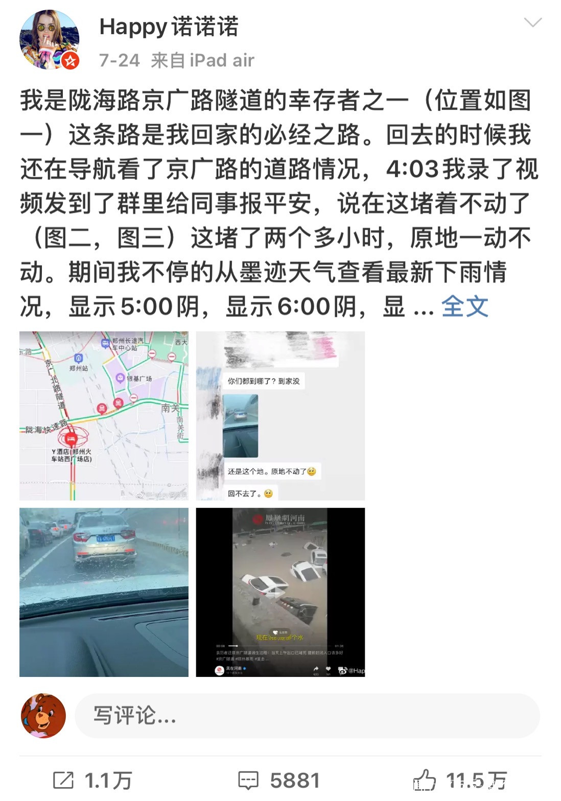 微博上名為@Happy諾諾諾 的博主分享了自己的親身經歷。作為隴海路京廣路隧道倖存者之一,她對於隧道未能及時封口的問題存疑。