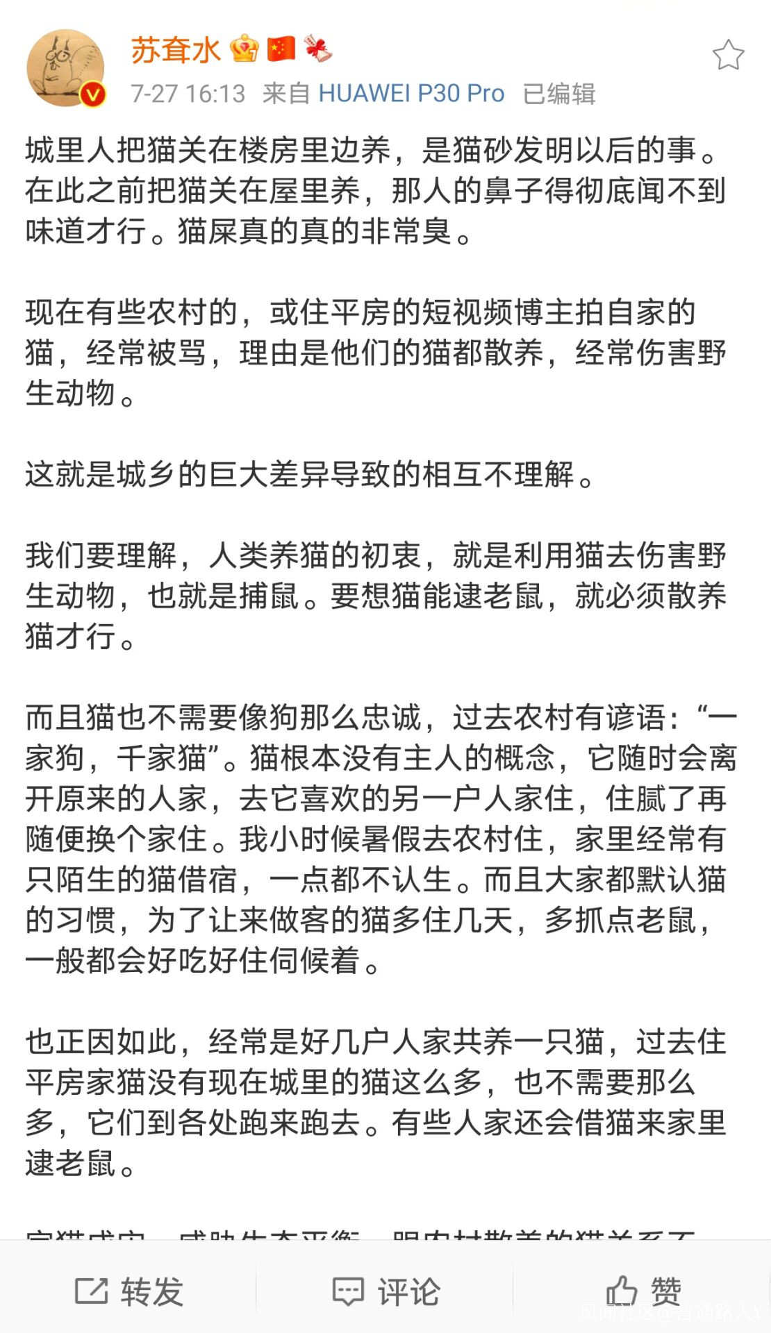 現在有些農村的,或住平房的短視頻博主拍自家的貓,經常被罵,理由是他們的貓都散養,經常傷害野生動物。這就是城鄉的巨大差異導致的相互不理解。我們要理解,人類養貓的初衷,就是利用貓去傷害野生動物,也就是捕鼠。要想貓能逮老鼠,就必須散養貓才行。