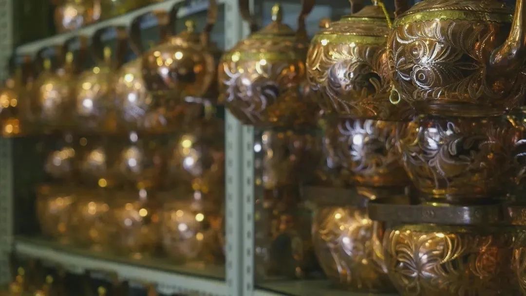 造型富有民族特色的“阿布都瓦和其拉布奇”(洗手壺和接水盆)“潘德努斯”(端盤)“恰衣那可”(茶壺)“薩瑪瓦爾”(茶炊)等銅製手工藝品,幾乎是每一位維吾爾族人民家裏的必備物件。