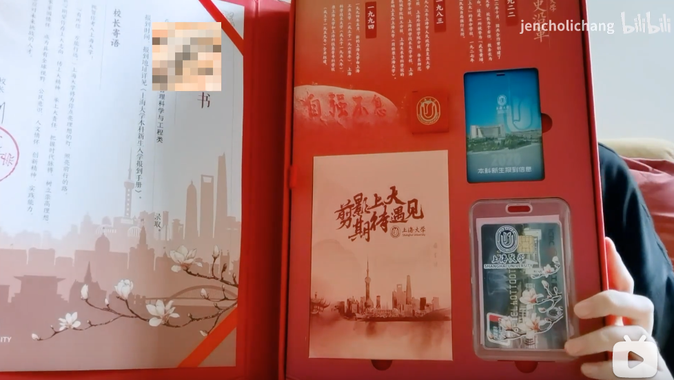 上海大學寄來的禮盒裏,校園明信片旁邊安靜躺着的,是需要存學費的銀行卡。