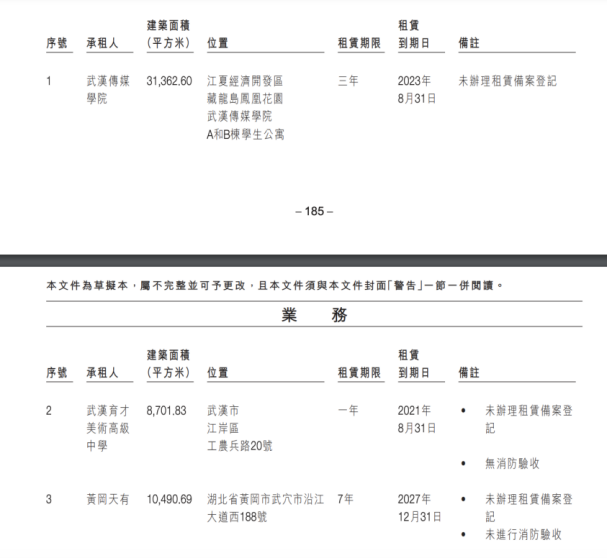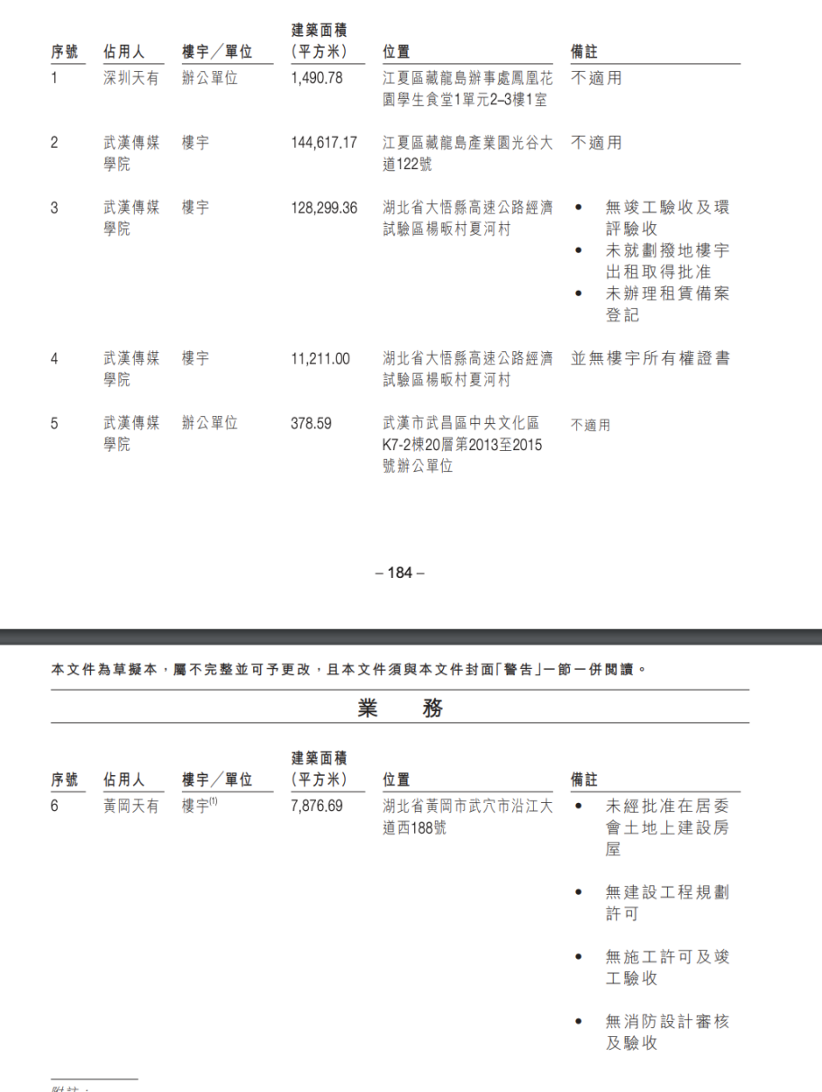 天有教育表示,武漢傳媒學院位於湖北省大悟縣高速公路經濟試驗區楊畈村夏河村、建築面積為12.83萬平方米的樓宇無竣工驗收及環評驗收、未就劃撥地樓宇出租取得批准、未辦理租賃備案登記。