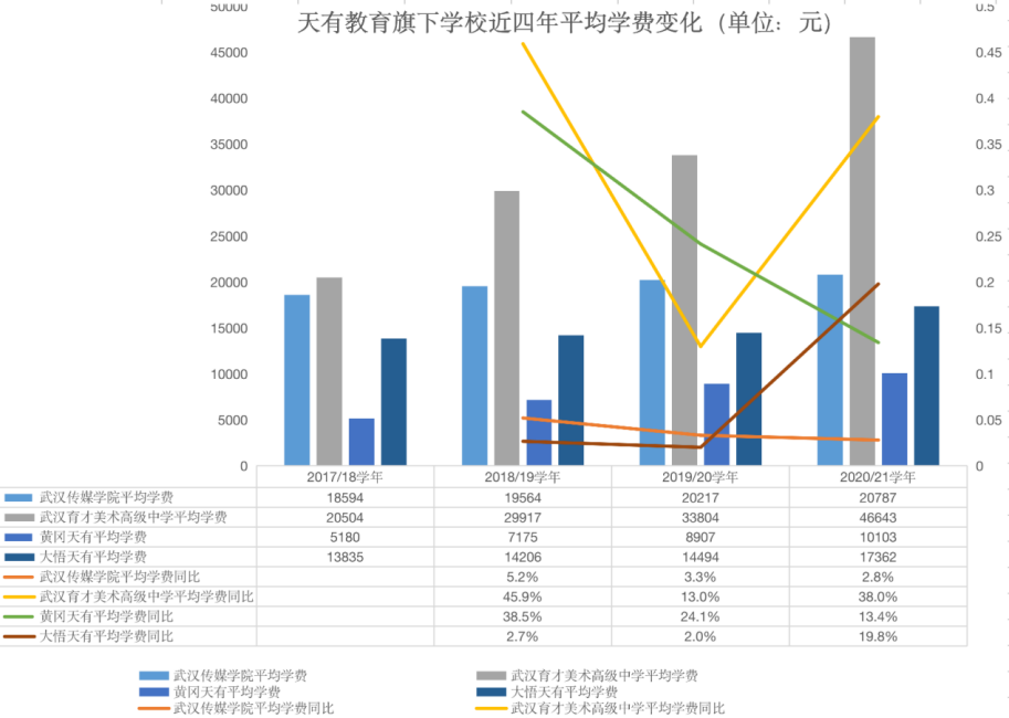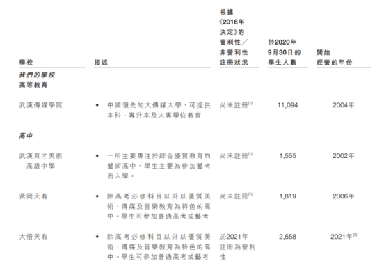 根據天有教育招股書,天有教育擁有一所大傳媒大學(武漢傳媒學院)、一所藝術高中(武漢育才美術高級中學)、兩所以“美術、傳媒、音樂教育為特色”的高中(黃岡天有、大悟天有)、且與江漢大學共同運營一所 “以藝術設計為主”的二級學院(江漢大學設計學院)。