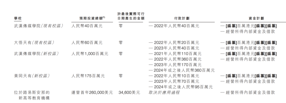 天有教育稱將投資百萬港元用於重建武漢傳媒學院光谷校區,包括重建三棟教學樓及四棟學生宿舍、用10億元建設武漢傳媒學院新校區、用1.75億元建設黃岡天有的新校區。同時,天有教育稱已在2021年6月向美國當地主管部門提交了設立新教育機構的申請,預計運營首年將投資26萬美元用於建設美國路易斯安那州建立高等教育機構。