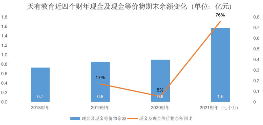 學費、學生數量雙雙增長,利潤表現良好,最終帶來其現金和現金等價物不斷上漲。截至2021年3月31日,天有教育擁有期末現金及現金等價物1.56億元,同比增長76%。