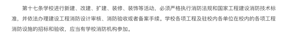 根據教育部、公安部2009年7月3日通過《高等學校消防安全管理規定》第十七條規定:學校進行新建、改建、擴建、裝修、裝飾等活動,必須嚴格執行消防法規和國家工程建設消防技術標準,並依法辦理建設工程消防設計審核、消防驗收或者備案手續。學校各項工程及駐校內各單位在校內的各項工程消防設施的招標和驗收,應當有學校消防機構參加。