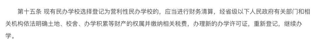 根據教育部、人力資源社會保障部、民政部、中央編辦、工商總局五部門在2016年12月30日聯合印發的《民辦學校分類登記實施細則》的規定:“第十五條,現有民辦學校選擇登記為營利性民辦學校的,應當進行財務清算,經省級以下人民政府有關部門和相關機構依法明確土地、校舍、辦學積累等財產的權屬並繳納相關税費,辦理新的辦學許可證,重新登記,繼續辦學。
