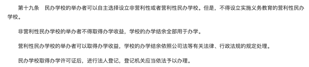 截至目前,天有教育僅有大悟天有註冊為營利性學校。根據《中華人民共和國民辦教育促進法》第十九條規定,民辦學校的舉辦者可以自主選擇設立非營利性或者營利性民辦學校。但是,不得設立實施義務教育的營利性民辦學校。