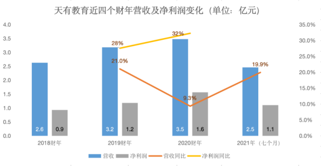 營收方面,天有教育呈現出不斷增長的趨勢。其中,2019財年、2020財年營收分別為3.2億元、3.5億元,分別同比增長21%、9.3%。2021財年(截至2021年3月31日的七個月)營收2.5億元,同比增長近20%。