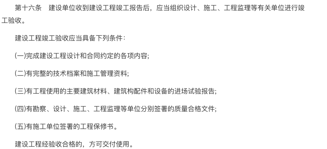 根據《建設工程質量管理條例》第十六條規定,建設單位受到建設工程竣工報告後,應當組織設計、施工、工程監理等有關單位進行竣工驗收。