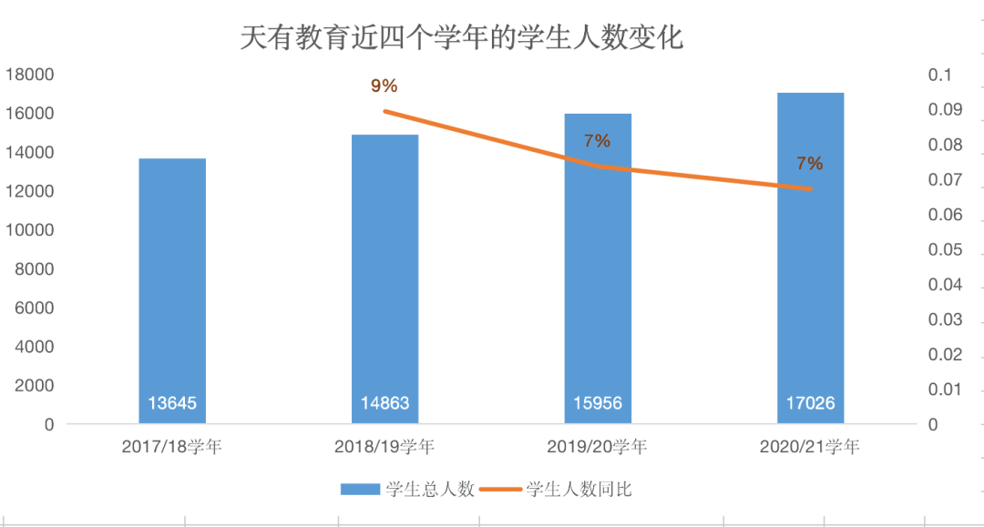 近四個學年,天有教育的學生人數也逐年增長。其中,2020/21學年,學生入學達到近四個學年最高值,學生人數為17026人,四年間增長了3381人。