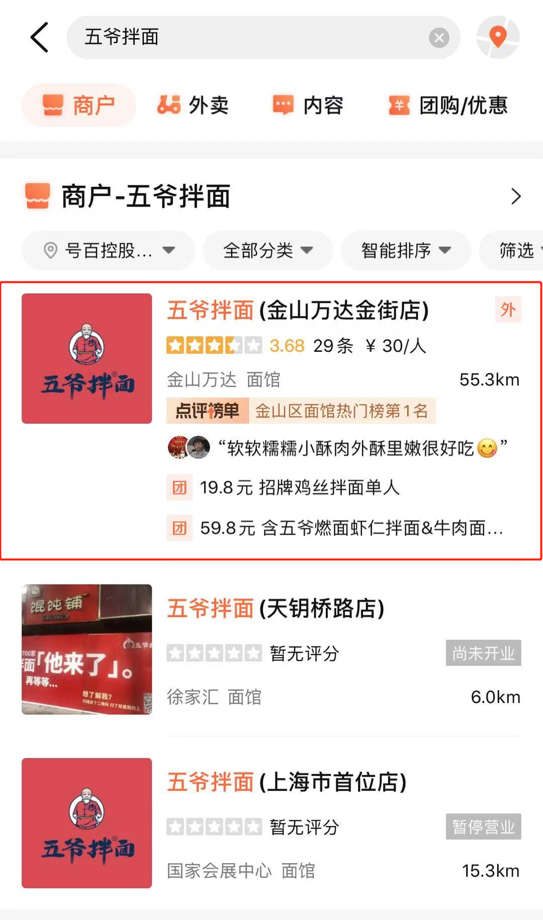 大眾點評顯示,上海目前只有一家五爺拌麪,客單價在30元/人。