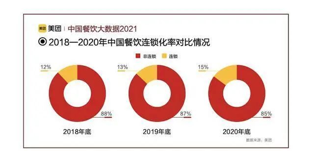 美團發佈的《中國餐飲大數據2021》顯示,中國餐飲市場連鎖化進程不斷加快,餐飲連鎖化率已由2018年的12.8%增長至2020年的15%。中金研報顯示,2018年美國、日本的餐飲業連鎖化率分別在54%和49%。