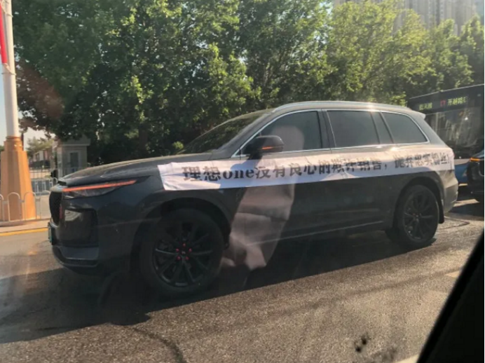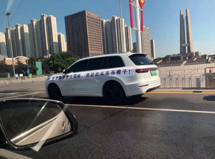 當時,有網友在微博上維權,發佈多張在理想ONE車身上貼着的各種橫幅,比如: