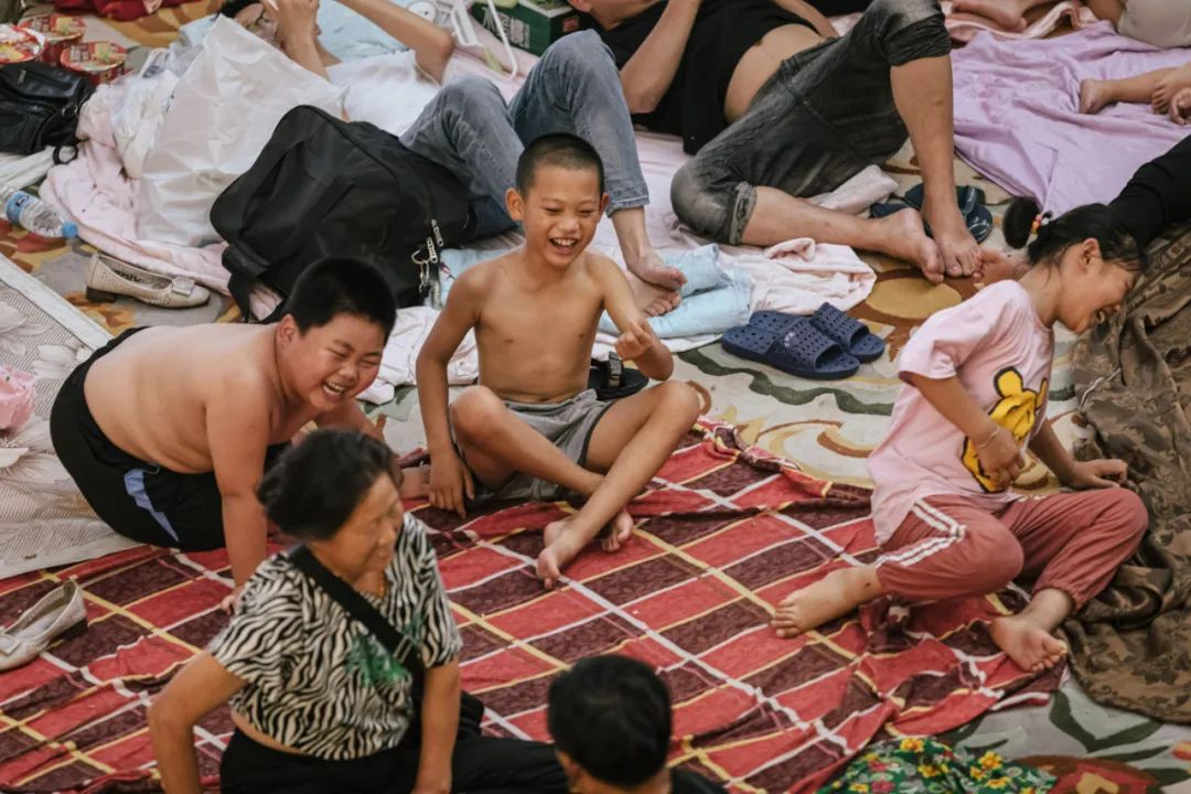 因為熱,男人們大多脱了上衣,光着膀子躺下。女人們撕一塊紙板作扇,一會給孩子扇風,一會給自己扇。孩童不知災難,三五成羣在大廳裏跑來跑去,臉上全是享受玩耍的笑容。