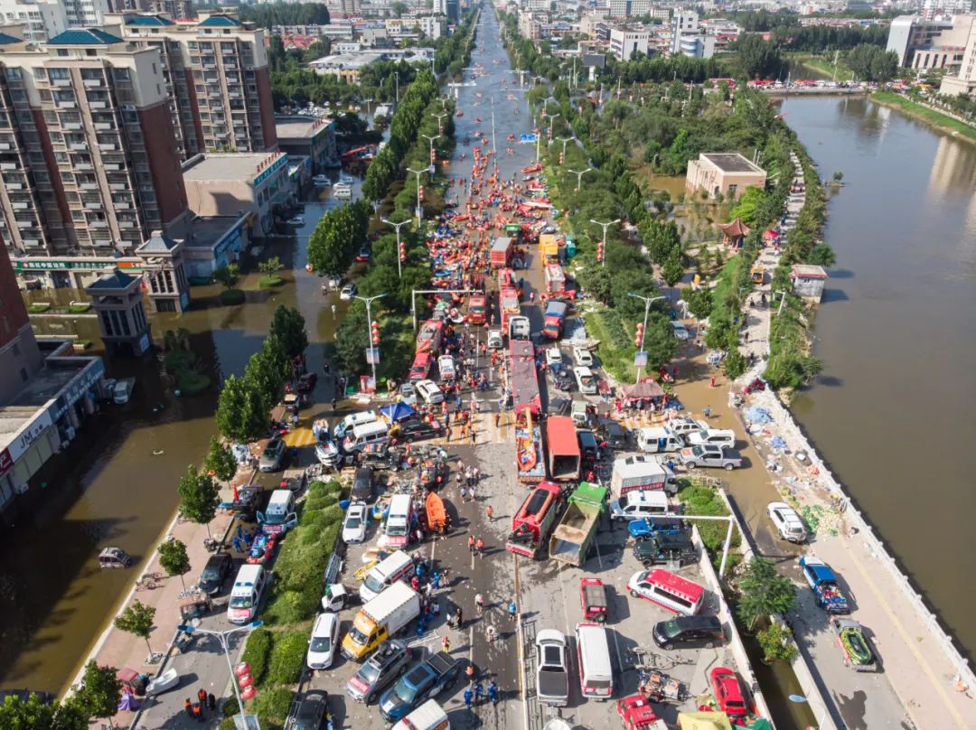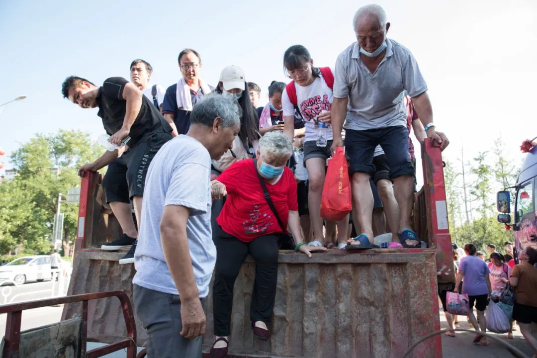 小朱莊內的人員在這一天基本完成疏散,但在更北邊,綠茵河畔等小區內還有人員被困。各式救援車輛將居民們送到安置點(攝影/郭嘉亮)