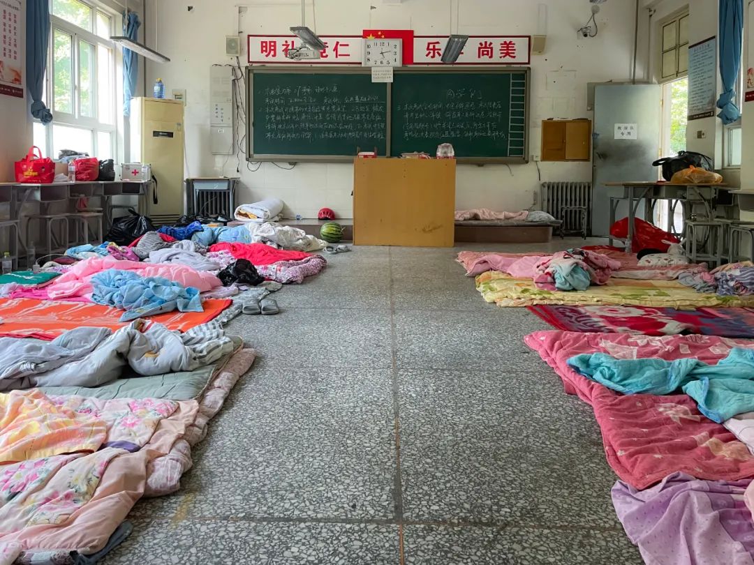 新鄉第二中學,一處政府組織的安置點。在其中,仍有許多穿着校服的稚嫩面孔。