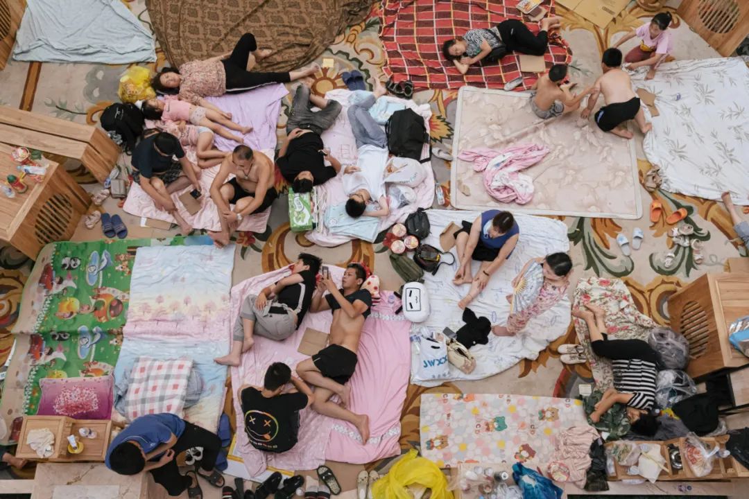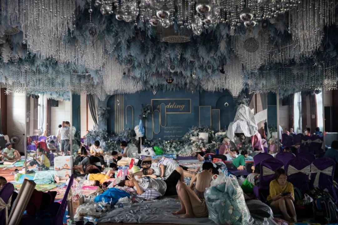 7月25日,衞輝市比干大道,受災羣眾在酒店裏休息。這家酒店為非指定安置點,商家自發為受災羣眾提供援助(攝影/郭嘉亮)