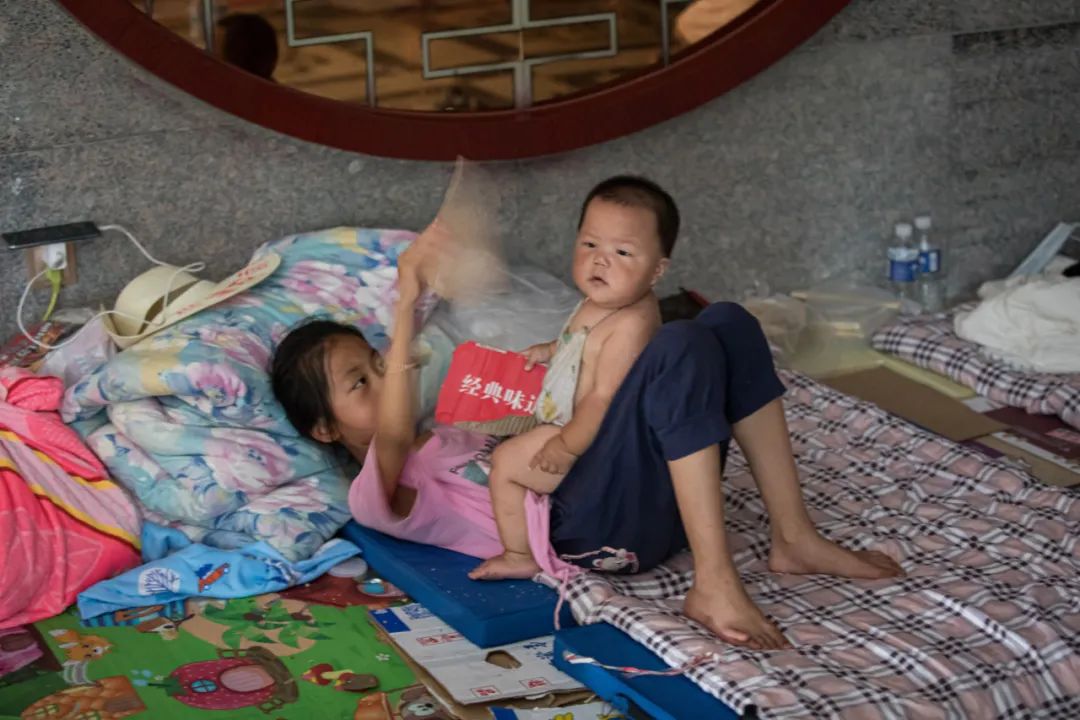 酒店內沒有空調,環境悶熱,小女孩給妹妹扇風(攝影/郭嘉亮)