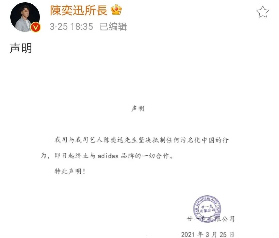前段時間新疆棉事件爆出,他立即曬出和阿迪達斯的解約聲明。