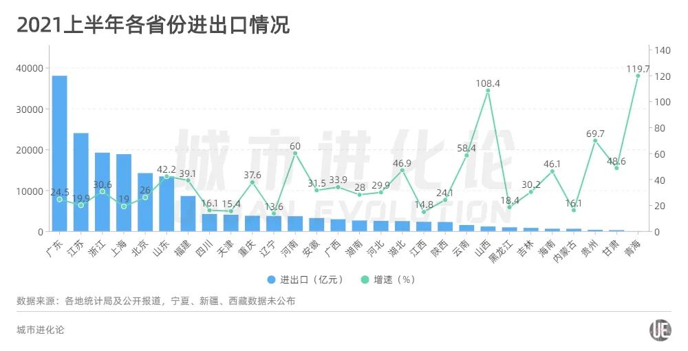 看增速,山西和青海又是“一騎絕塵”,上半年青海實現進出口同比增長119.7%,山西進出口總額同比增長108.4%,兩省數據與後面拉開了差距。