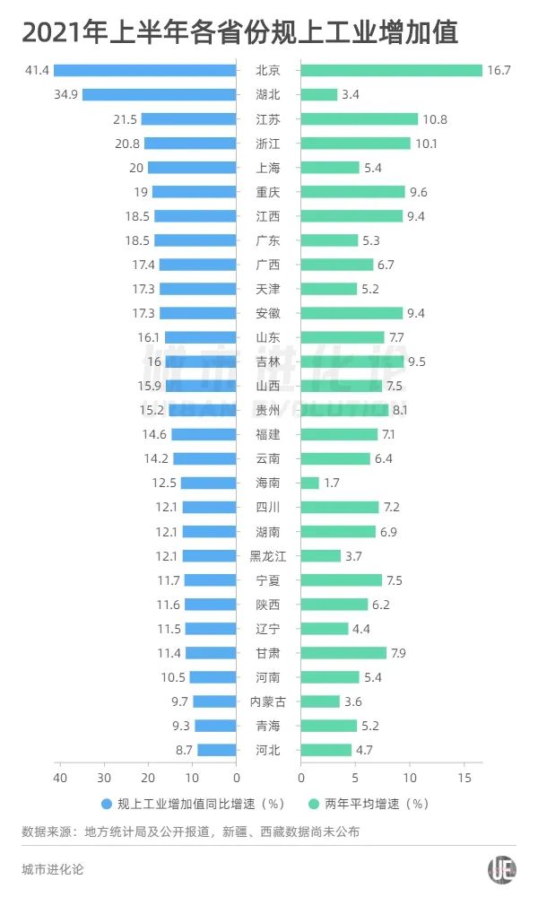 統計各省規上工業增加值來看,北京41.40%的同比增速、16.7%的兩年平均增速,可謂一騎絕塵,躍居全國第一。