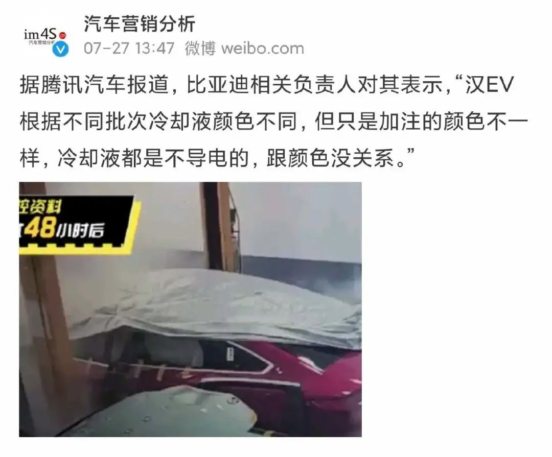 今天上午,比亞迪相關負責人又表示,不同批次冷卻液顏色不同,但都是不導電的。