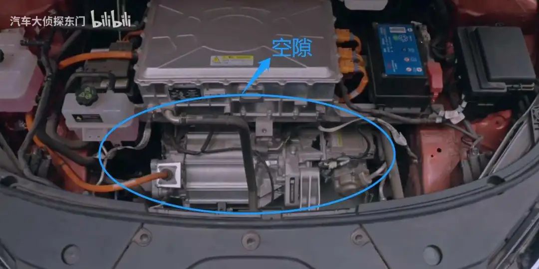 除了蓄電池,漢 EV 的設計製造平台並不是為純電動車打造的,所以可能某些為純電動汽車的安全性設計並沒有考慮周全,比如上面圖中放油車發動機的地方出現了大面積空隙。