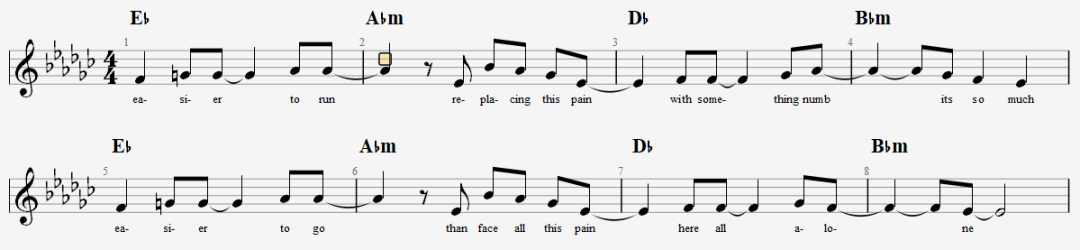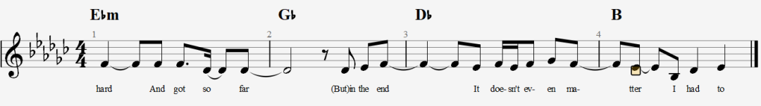 在Ebm和絃裏,「hard」使用的音符是F,「so」使用的音符是Db,可以看作是一個Eb7sus2和絃,旋律的色彩十分特別。