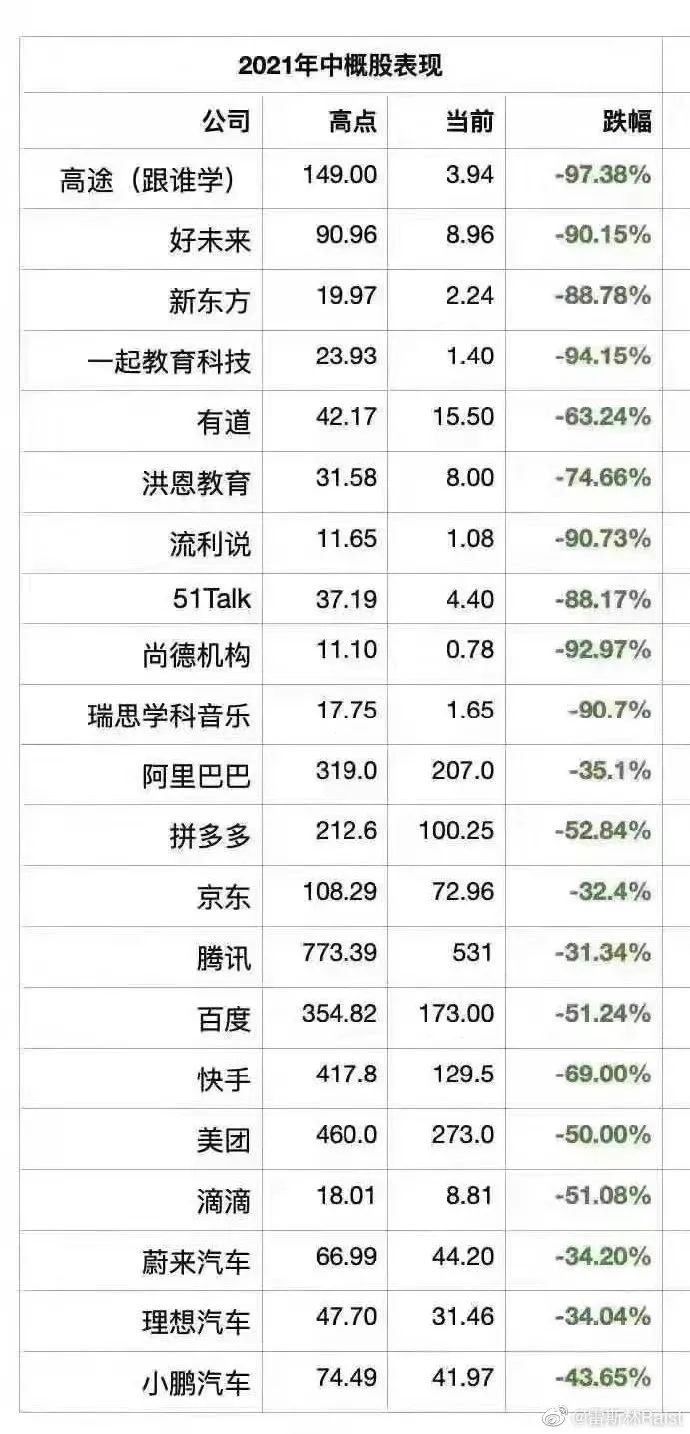 持有白酒的,重倉醫療的,買了中概股的一個比一個慘,尤其那些買了教育相關股票的,基本都是朝着十不存一的慘烈狀態去了。甚至還有跌了97%的,讓人大開眼界。