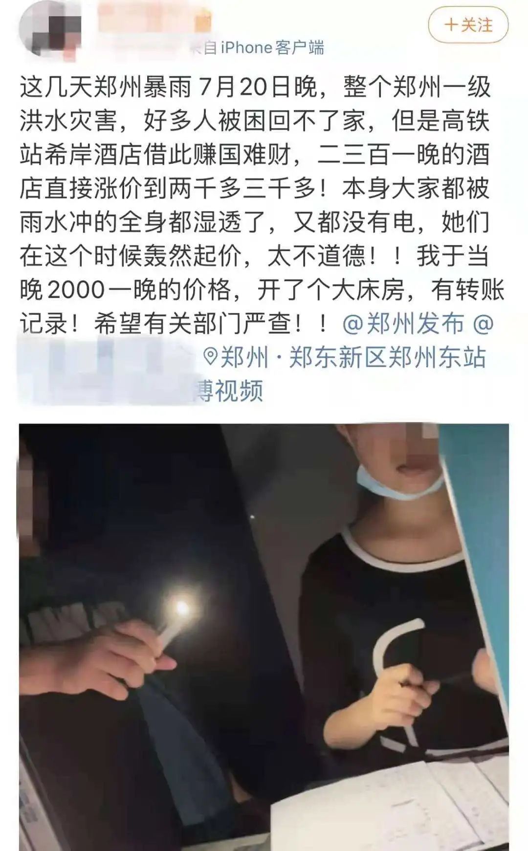 鄭州高鐵站附近的“希岸酒店”,平時價格300-400元的房間,災情期間,竟然要價2000-3000,比平時高出5、6倍。
