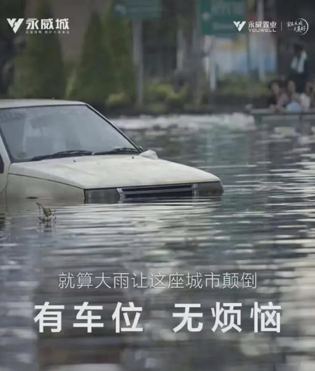 “就算大雨讓這座城市顛倒,有車位,無煩惱”
