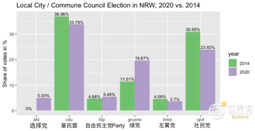 而在今年聯邦大選中,綠黨第一次有了主政聯邦政府的野心。以目前的輿論形勢來看,綠黨的選民基本面是很好的,並且有向更好發展的潛力。筆者這裏以北威州為分析案例。去年(2020年)的北威州各縣市議會選舉中,綠黨就已經將選票翻倍,來到將近20%大關。反觀兩大傳統“全民政黨”,即基民盟與社民黨,皆在2020年選舉中有所損失。