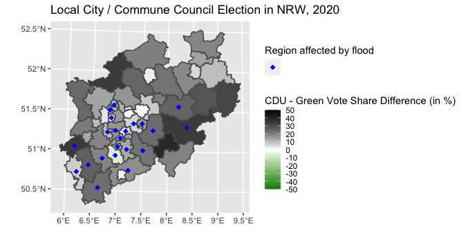 2020年,綠黨已經在萊茵河畔的主要地區縮小了對基民盟的差距(即下圖中間聚集的藍點,也是這次強降雨受災嚴重的縣市)。下圖中的兩黨差距以色差體現:越偏黑,基民盟對綠黨的優勢越大;越偏綠,綠黨對基民盟的優勢越大;越接近白色,兩黨的競爭越激烈(即得票率越接近)。
