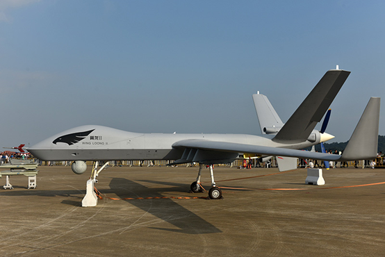 2016年11月2日,在第十一屆中國國際航空航天博覽會上展示的國產翼龍Ⅱ型無人機。圖|新華社