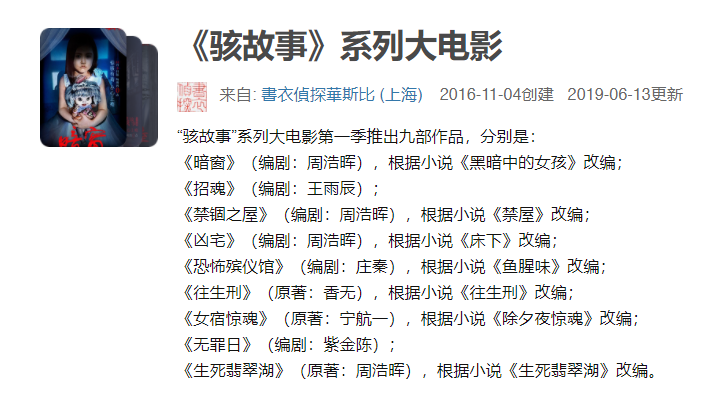 這一IP可以説是既幸運又不幸。幸運的是趕上了國內第一波懸疑網劇熱潮,售出版權開花結果,已播加未播的相關影視作品已多達12部。不幸的是該IP同樣遇到了分拆售賣的情況,六部劇集涉及到六套人馬、五家平台,離譜程度更甚於《盜墓筆記》與《鬼吹燈》。
