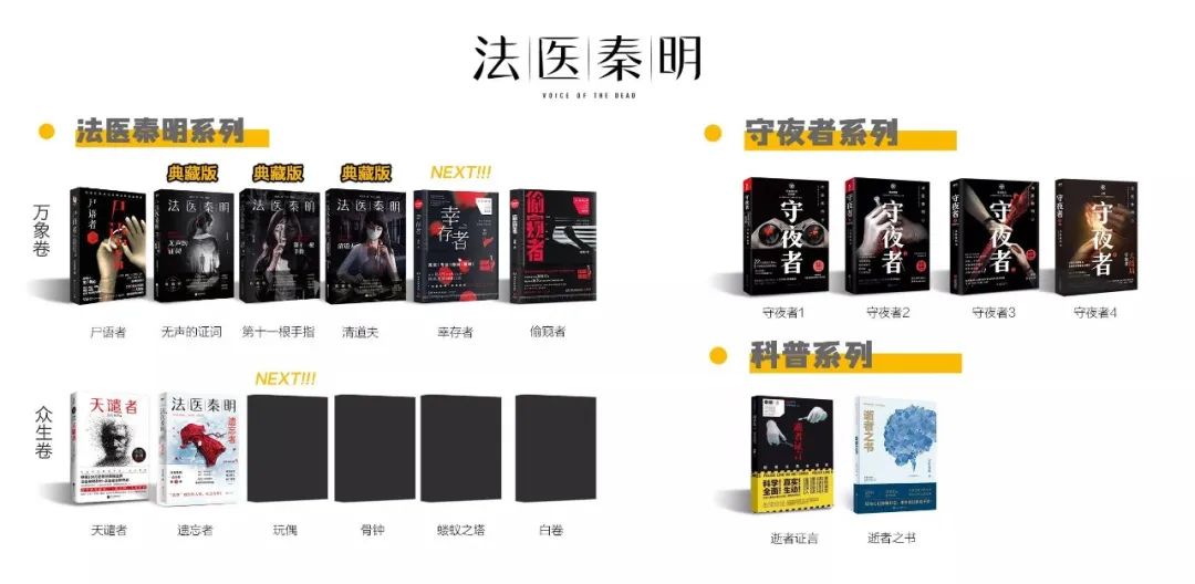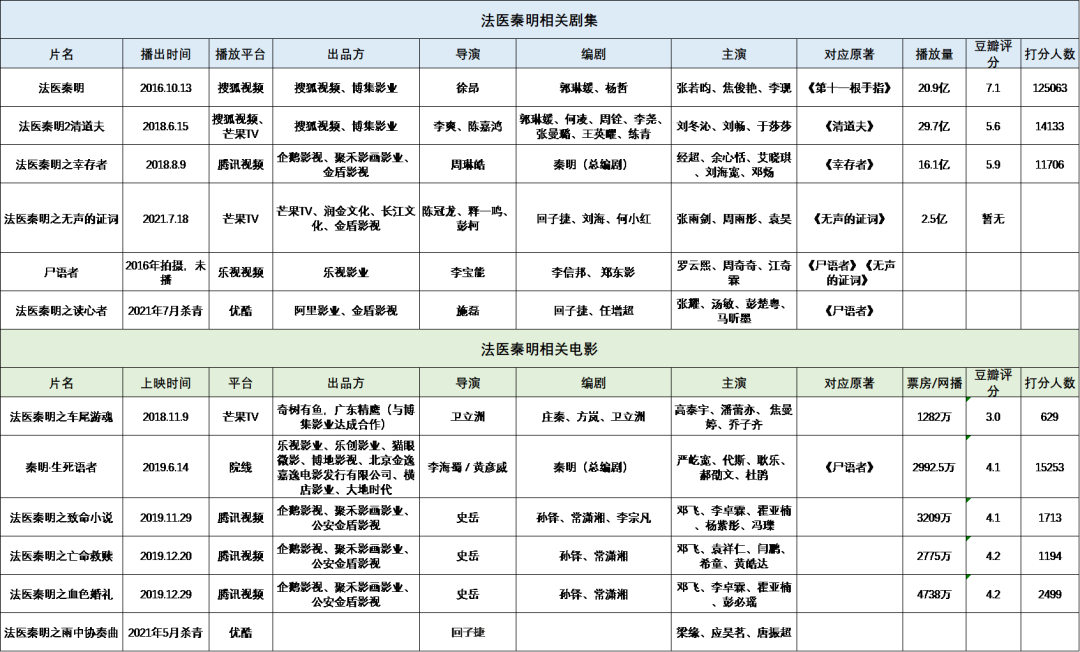 在真人劇版令《法醫秦明》知名度與IP價值猛增的2016年,該系列小説僅有五部面世。其中,第一、第二部《屍語者》《無聲的證詞》被樂視買走,第三部、第四部《第十一根手指》《清道夫》則由中南博集天卷旗下影業聯合搜狐視頻開發,第五部《倖存者》在當時還沒有歸屬。